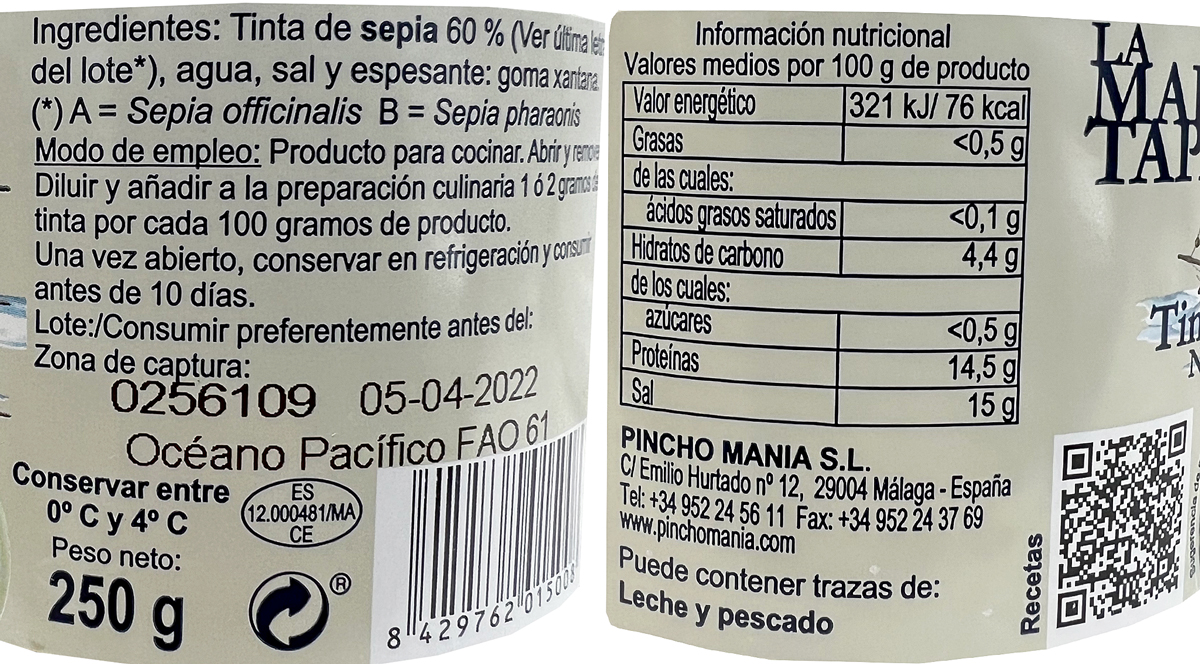 Tinta de sípia procedent del seu embolcall natural i addicionat de sal, aigua i espessidor.